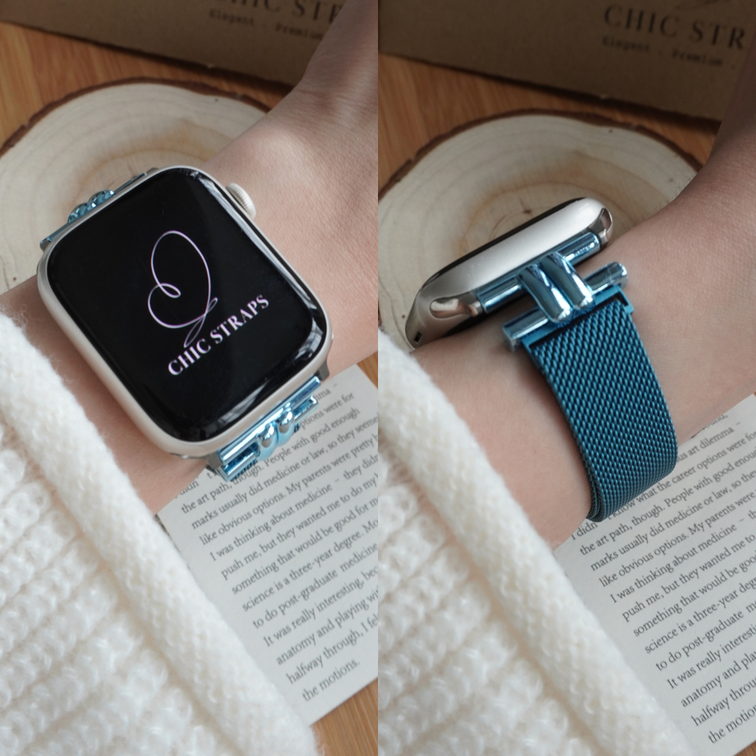 But what truly sets this watchband apart is its unique sophisticated connector. Meticulously engineered for a seamless fit, it adds a touch of luxury to your Apple Watch, elevating its aesthetic to new heights. The connector's refined design not only ensures a secure connection but also enhances the overall elegance of the band.